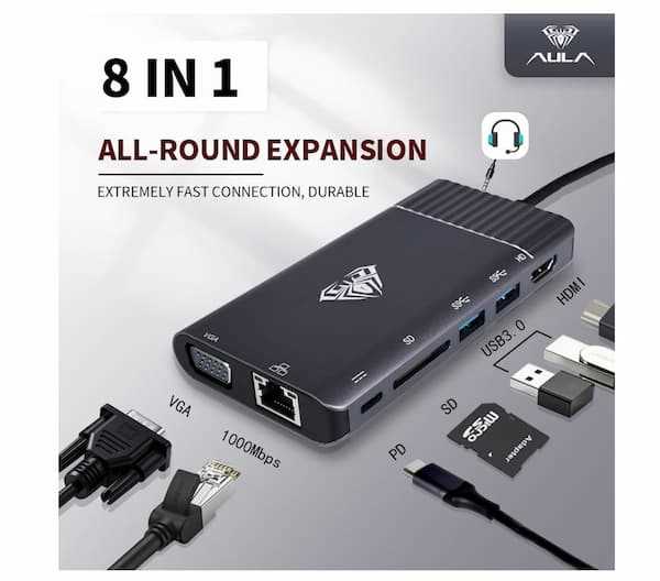 Home Networking USB Hubs Aula OT-95117 8 In 1 Usb C To Hdmi 4k 30hz /vga /pd /gigabit Lan Port & Sd Card Slot (3.0 X 2 / 3.5mm)