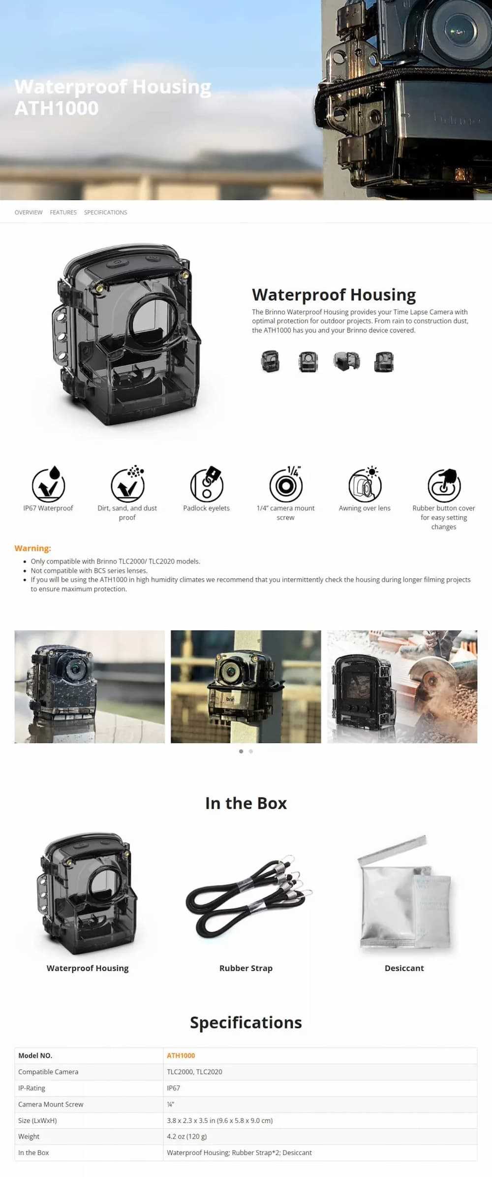 Home Networking Cameras & Surveillance Accessories Brinno ATH1000 IPX67 Clear Waterproof Housing Camera Case, Compatible with TLC2000/TLC2020 Series - Black