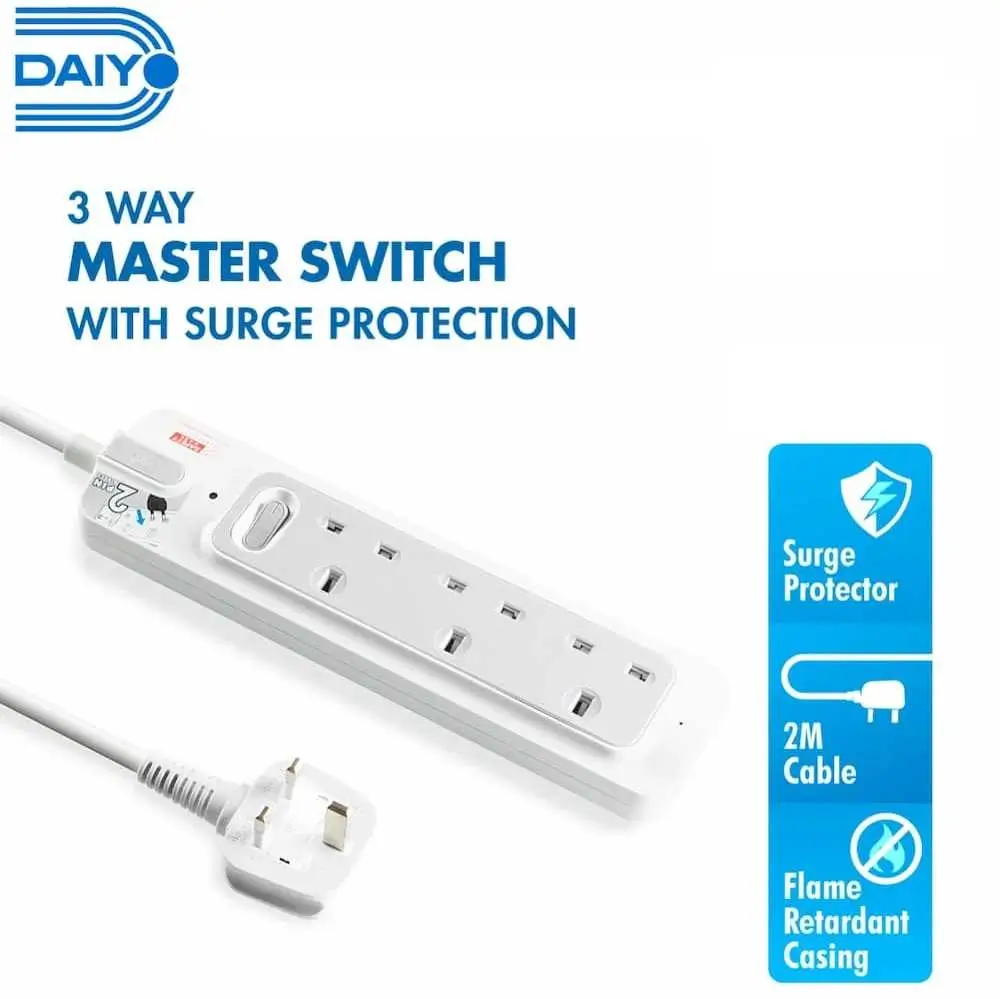 Home Testers and Tools Fiber Testers Power Meters Hot Daiyo DE 363-2M Master Switch 3 Way Extension Socket Strip 2 Meter long (White)