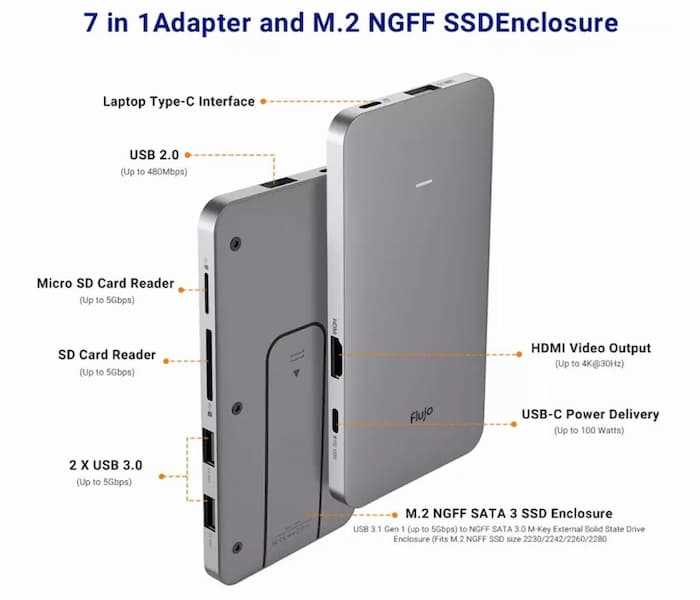 Home Networking USB Hubs Flujo CH-65 7 in 1 USB-C Hub 2xUSB 3.0 Ports 1xUSB 2.0 Port 1xSD/Micro SD Card Reader with 1xHDMI Port Type C Adapter