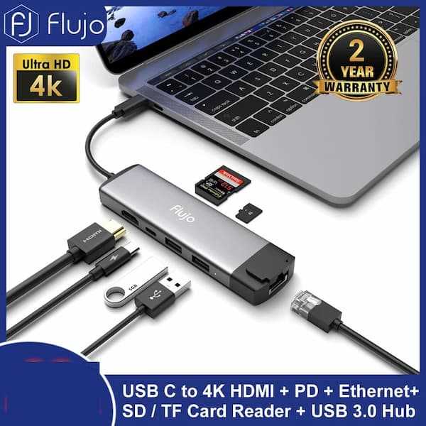 Home Networking USB Hubs Flujo FJ-CH-55-G 7-in-1 USB-C Hub with 4K HDMI, Gigabit Ethernet, 60W Power Delivery