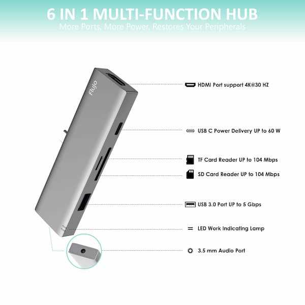 Home Networking USB Hubs Flujo FJ-CH-57-G USB-C Multi-Function Aluminium Hub with 4K HDMI, 60W Power Delivery
