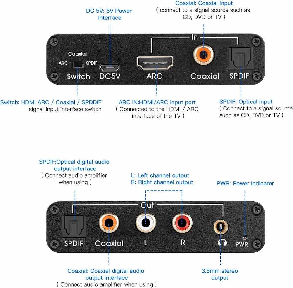 Home Networking Network Switches HDMI ARC Audio Extractor 192KHz DAC Converter ARC Audio Extractor Support Digital HDMI Audio to Analog Stereo Audio RCA L/R Coaxial SPDIF and 3.5mm Ja...