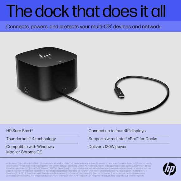 Home Electronics Computer Peripherals HP 4J0A2AA Thunderbolt 4 USB-C Docking Station, 120W, 4K Quad Display, 2.5Gb Ethernet, Black