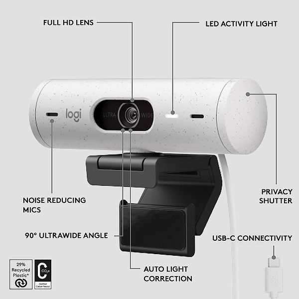 Home Networking Conferencing, Phones Logitech Brio 500 1080p Full HD Webcam with Auto Light Correction, Show Mode, Dual Noise Reduction Mics, , Zoom, USB-C Cable (Off White)