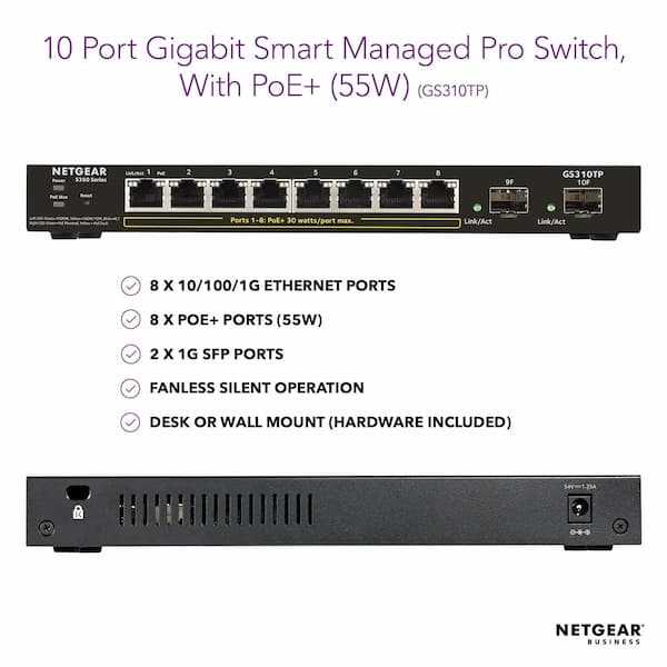 Home Networking Network Switches Netgear GS310TP-100INS 10-Port Gigabit Ethernet Smart Managed Pro PoE Switch PoE+ 55W, Desktop/Fanless Housing