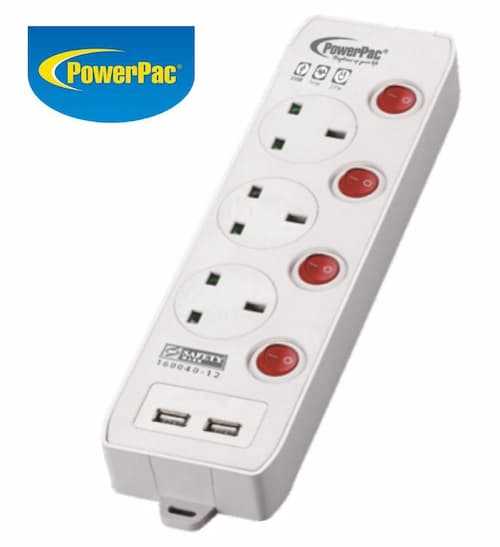 Home Networking USB Hubs PowerPac PP133U to PP135U Extension Cord | 3%u20135 Way Socket, Dual USB Ports, 3M Cable