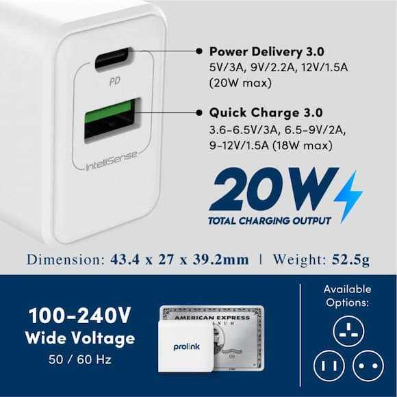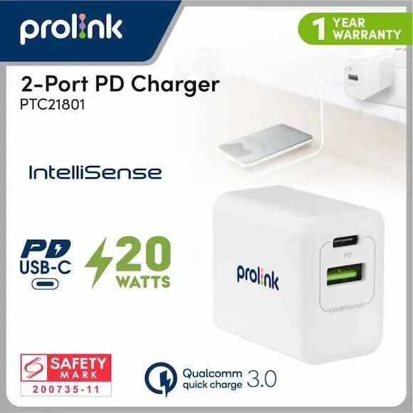 Home Networking Power Prolink PTC21801 20w 2-Port PD Charger Travel Wall Charger with IntelliSense Fast charge