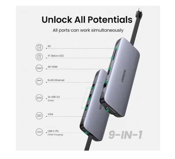 Home Networking USB Hubs Ugreen 40873 9-in-1 USB-C Hub | USB-C To HDMI VGA RJ45 PD 100W Adapter For MacBook | Surface | iPad Pro