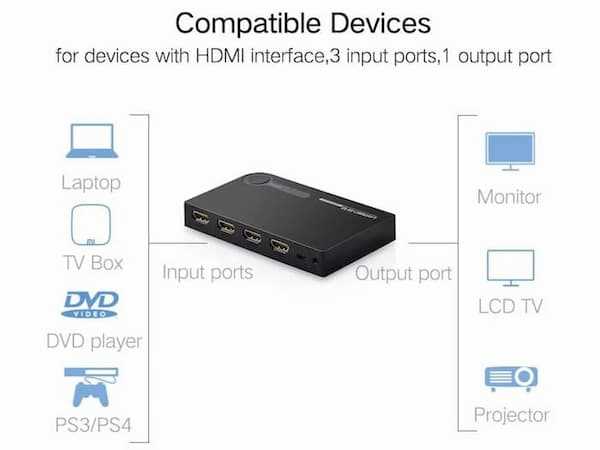Home Networking USB Hubs Ugreen 40234 HDMI Switch 4K 3 Port HDMI Switcher Splitter Hub 4K Full HD 1080P 3D Compatible for PC Laptop, Xbox 360 One, PS4 PS3, Nintendo Switch, Bl...