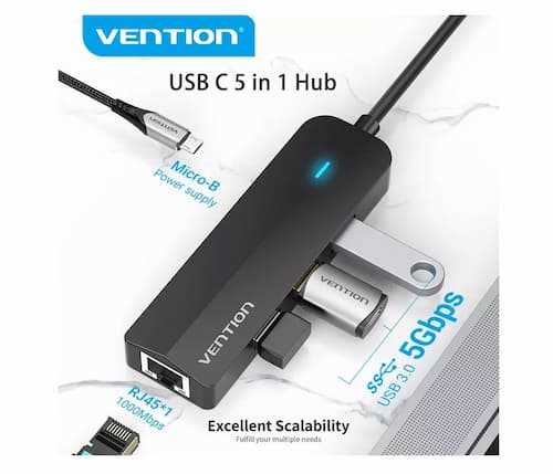Home Networking USB Hubs Vention TGT, TGP, TGO USB Type-C Hub 5-in-1 Adapter | USB 3.0 Multiport With Gigabit Ethernet RJ45