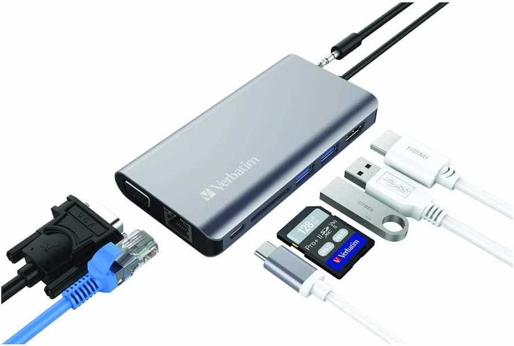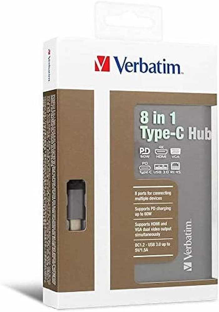 Home Networking USB Hubs Verbatim (8 in 1) Type C Hub with VGA / HDMI / RJ45 /USB3.0x2 PD 60W SD & Earjack (Grey)